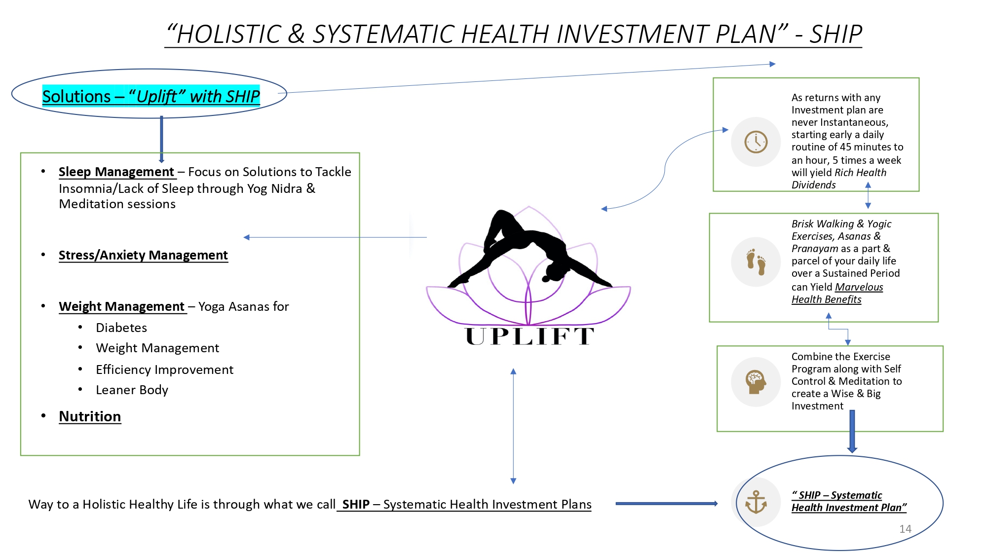 Upllift believes that by combining Exercise programs with Self Control ( Aahm & Vihaan ) along with meditation, can create a Wise & Big Investment through “SYSTEMATIC HEALTH INVESTMENT PLANS” to lead a Healthy Life.